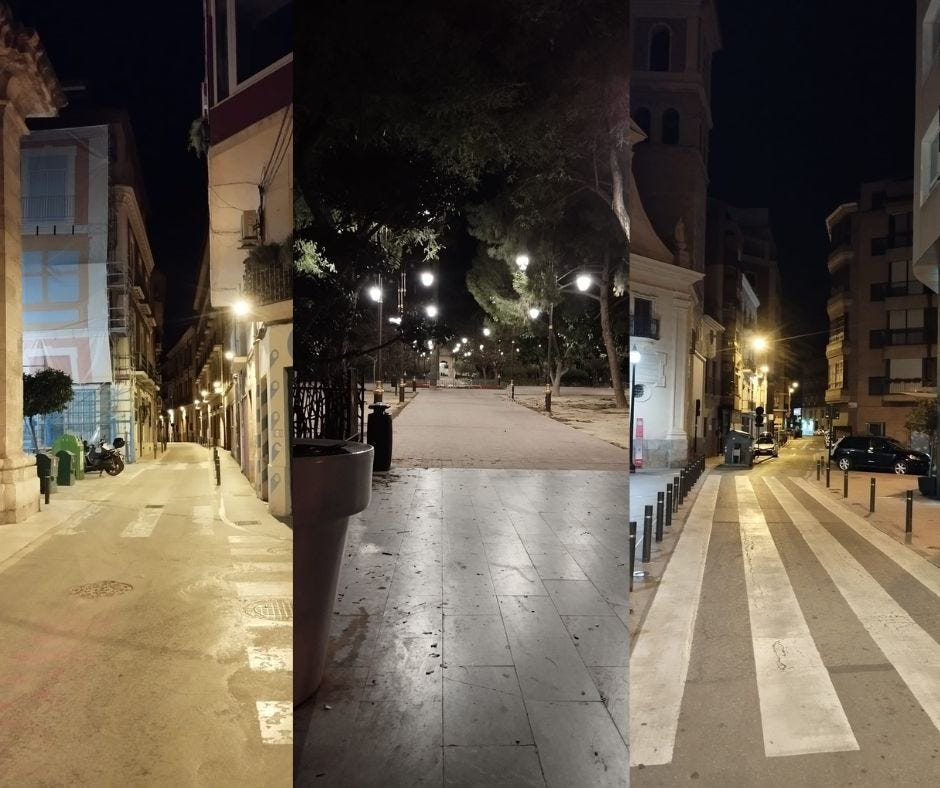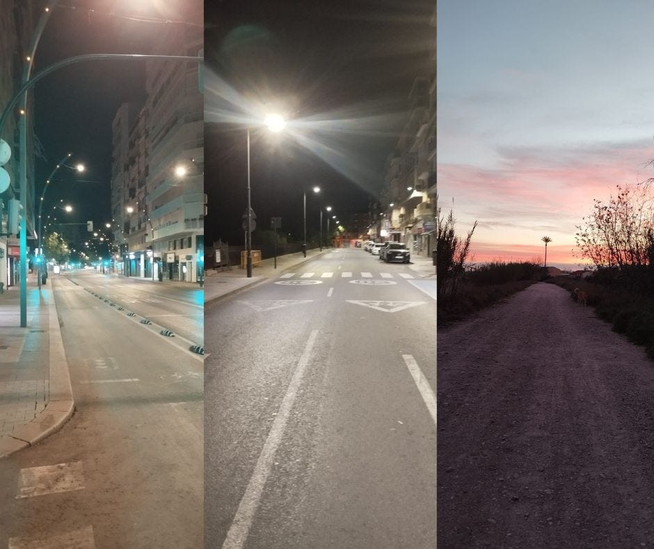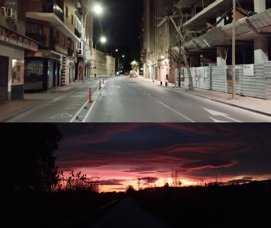 Buena pregunta. Me tomo un café. Vacío y lleno el lavavajillas. Limpio las cajas de las gatas. Hago tiempo, que es uno de mis conceptos favoritos de todo el castellano. Enseguida la cafeína me acelera el discurso interior: anda, gracias, justo lo que necesitaba ahora mismo, querida cafeína. Pero la cafeína no detecta la ironía (he escrito iroína por error y he estado a punto de dejarlo). Le echo comida al perro a ver si quiere desayunar también. Pero no. El perro pasa de desayunar. El perro quiere lo que quiere siempre: pasear. Y a mí no me quedan más opciones. Así que ahí estamos, Rómulo y yo. En ropa de deporte (más o menos). Recorriendo las calles desiertas de Murcia a las 4:30 AM de un martes laboral.